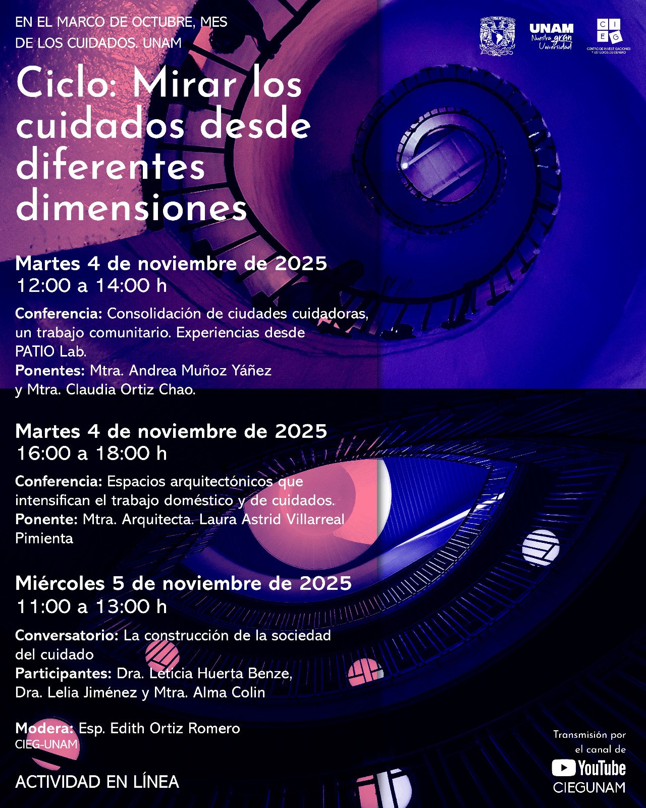 El 4 de noviembre de 2025, las integrantes de PATIO, Andrea Muñoz Yáñez y Claudia Ortiz Chao, participamos en el espacio: “Consolidación de ciudades cuidadoras, un trabajo comunitario. Experiencias desde PATIO lab”, como parte del Ciclo: Mirar los cuidados desde diferentes dimensiones, organizado por Edith Ortíz Romero y Nina Höchtl, integrantes del Centro de Investigaciones y Estudios de Género (CIEG) y PATIO lab.